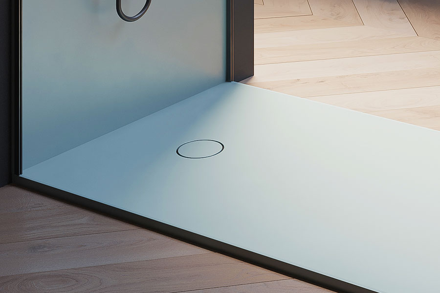 Receveur d’une extrême sobriété avec ses pentes douces et son cache-bonde en SMO™ assorti, pour une intégration parfaite dans la salle de bains.